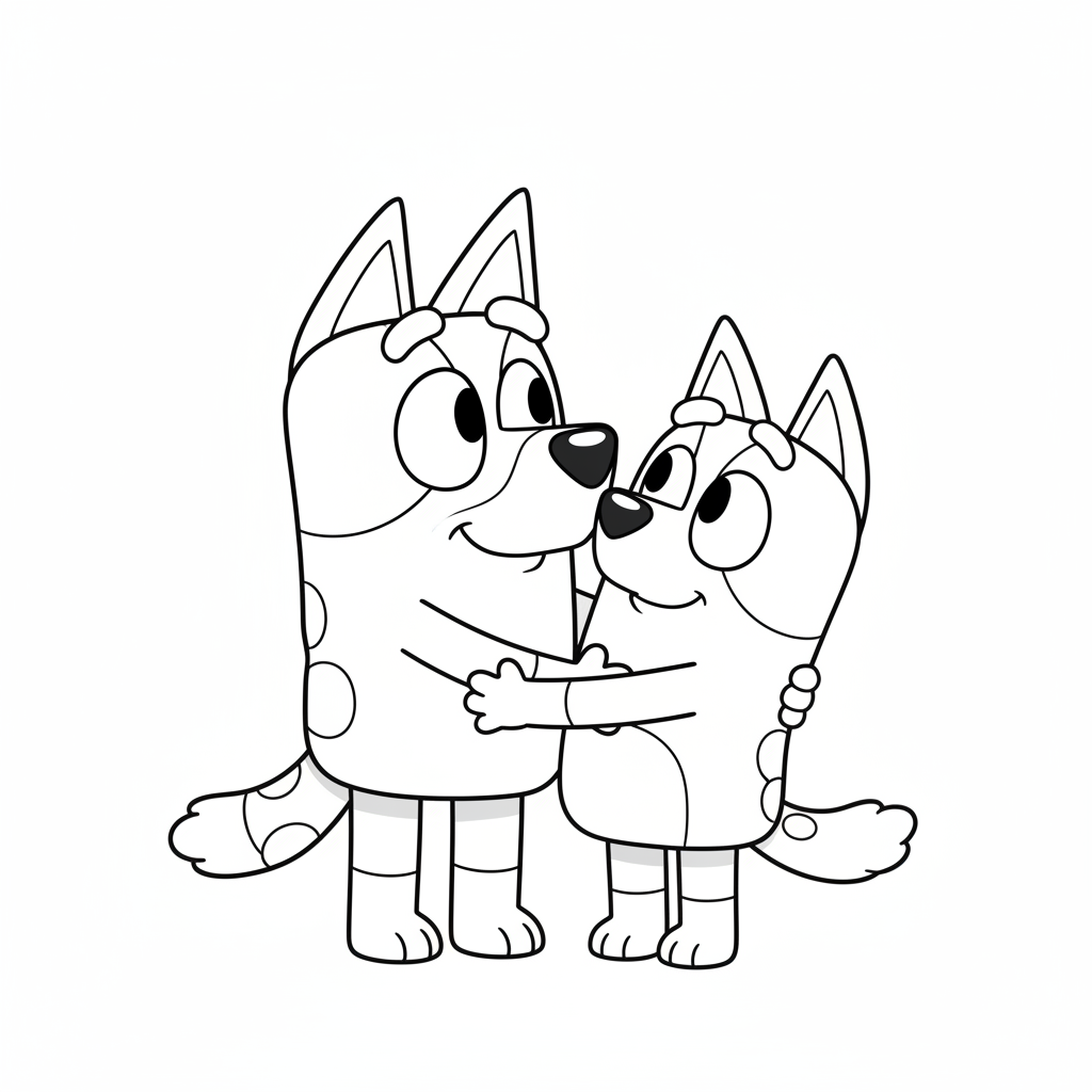 A delightful bluey coloring page featuring Bingo and Bluey sisters hugging together lovingly. Perfect for kids and adults who love coloring!