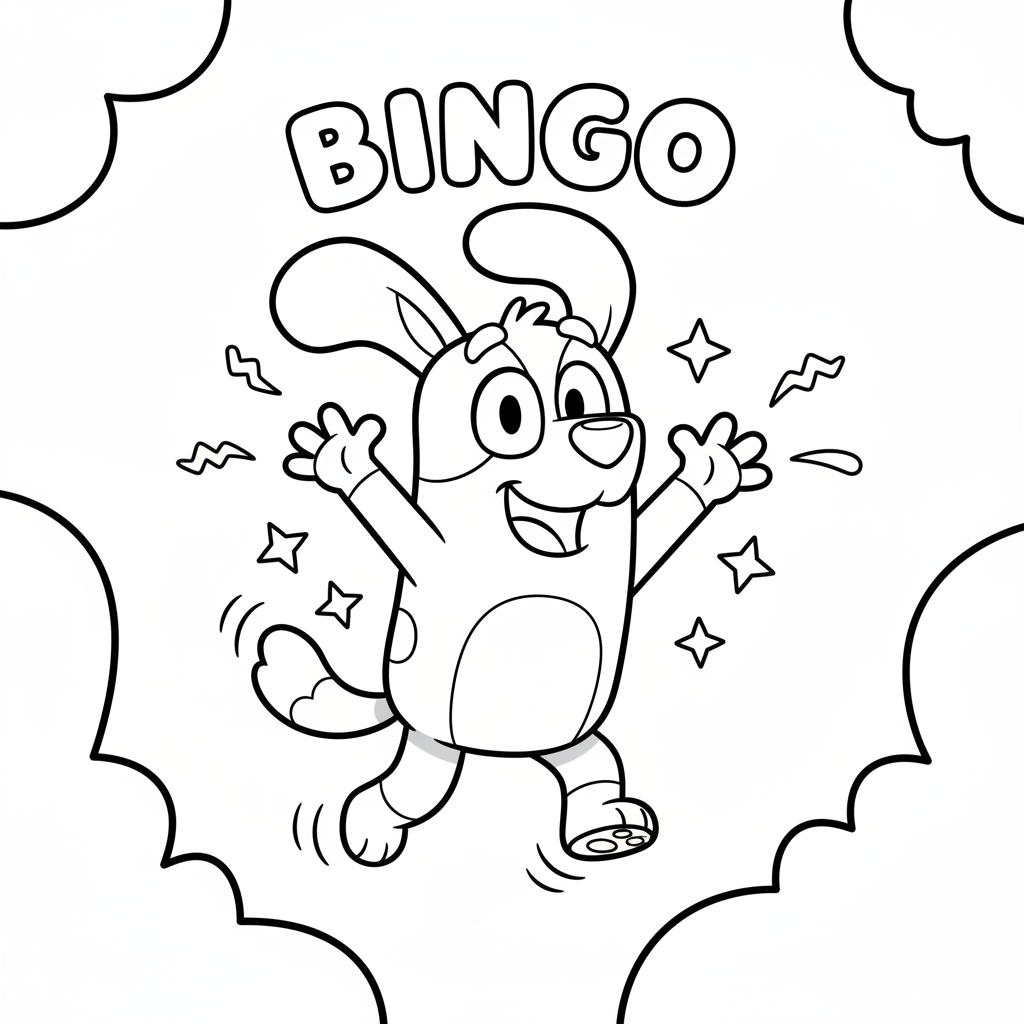 A delightful bluey coloring page featuring Bingo excited jumping up and down joyfully. Perfect for kids and adults who love coloring!