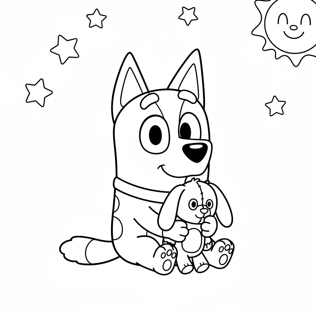 A delightful bluey coloring page featuring Bingo holding her favorite toy Floppy bunny. Perfect for kids and adults who love coloring!