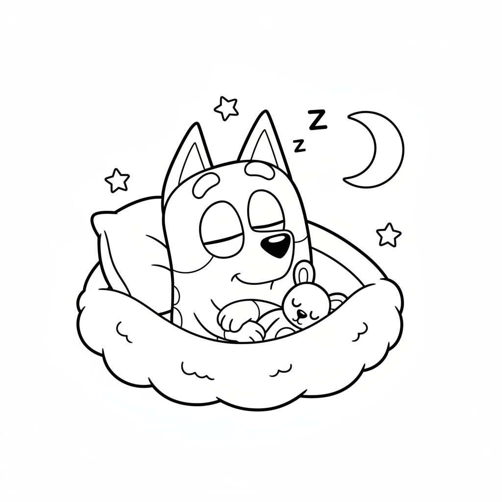 A delightful bluey coloring page featuring Bingo sleeping peacefully cute and adorable. Perfect for kids and adults who love coloring!