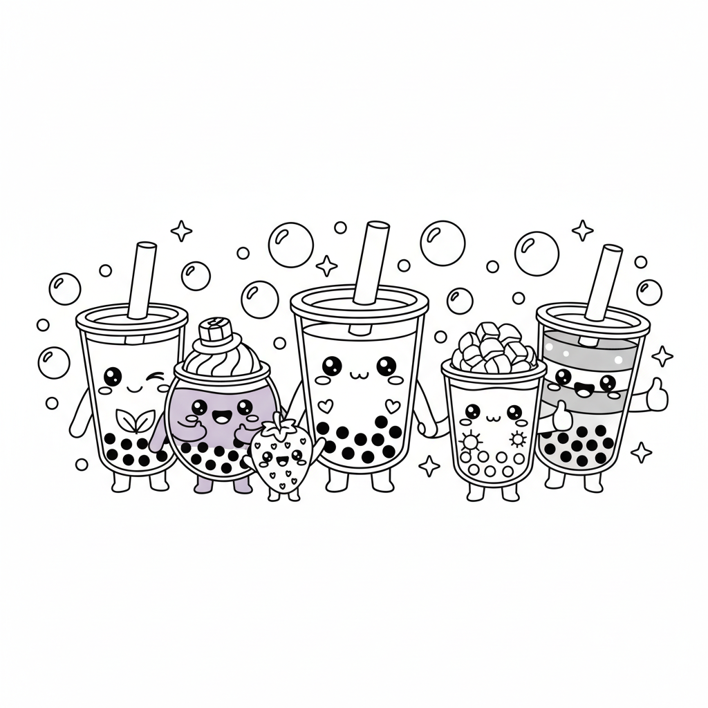 A delightful boba coloring page featuring boba tea friends group of different flavored drinks together. Perfect for kids and adults who love coloring!