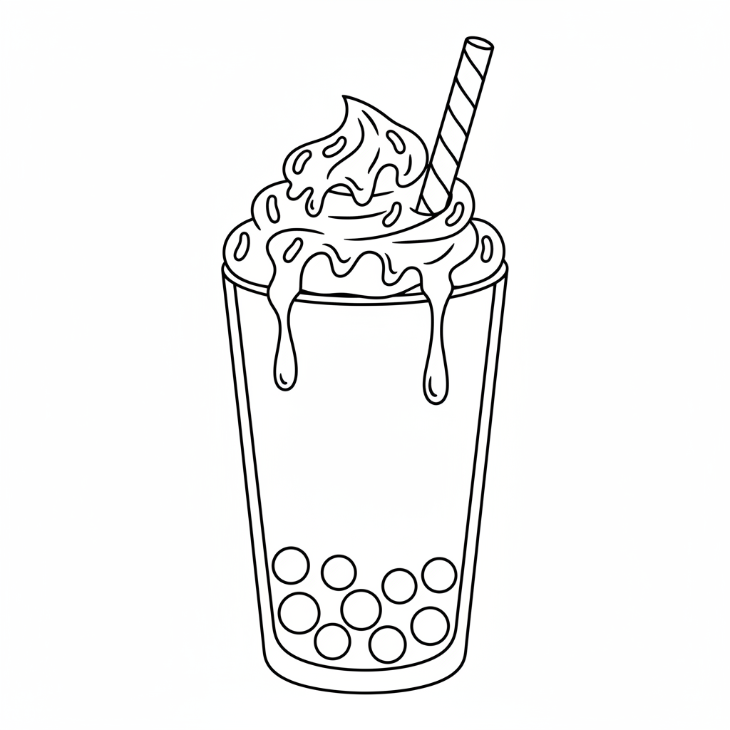 A delightful boba coloring page featuring chocolate boba tea with whipped cream and cocoa drizzle. Perfect for kids and adults who love coloring!