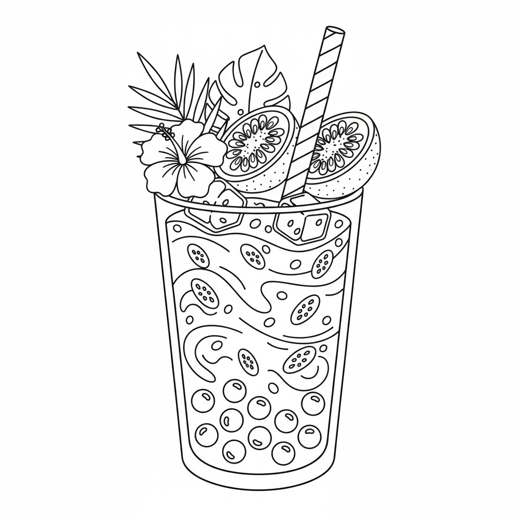 A delightful boba coloring page featuring passion fruit boba tea tropical yellow with seeds. Perfect for kids and adults who love coloring!