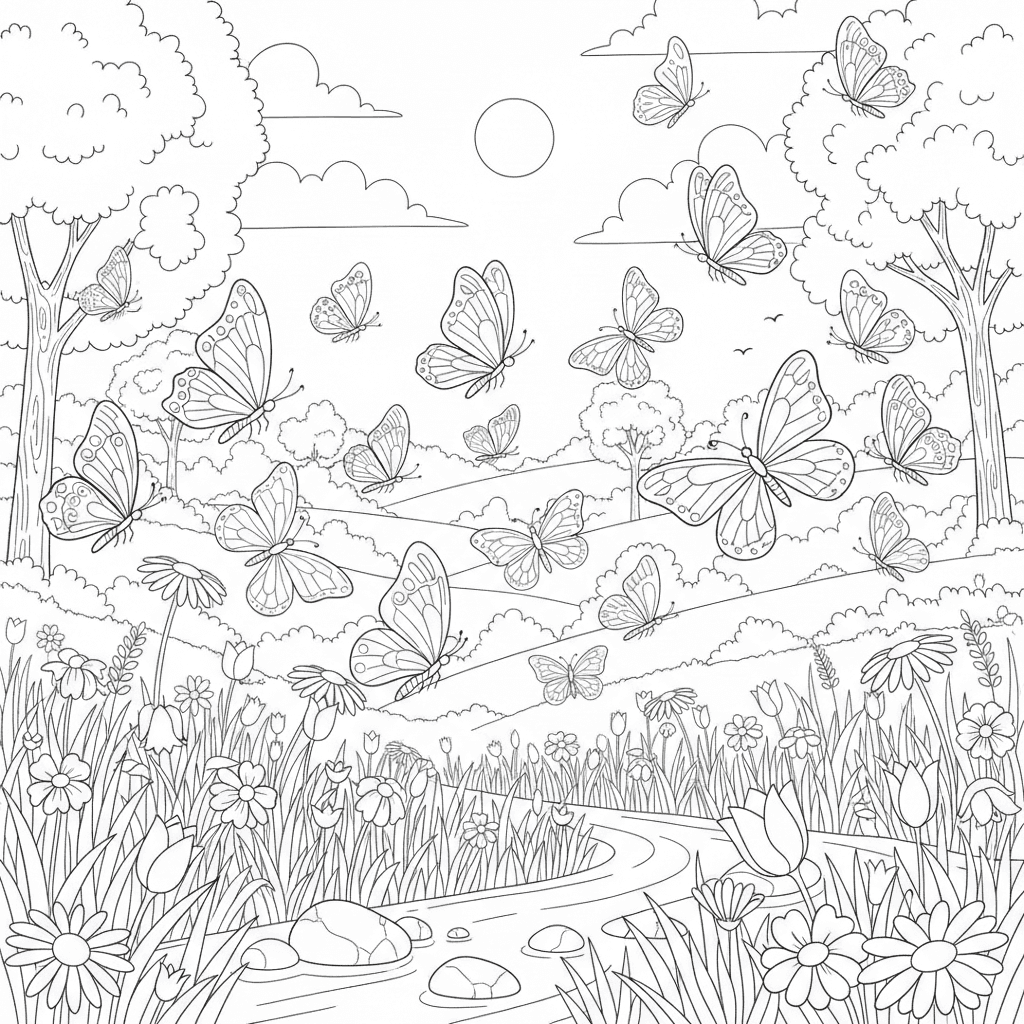 Beautiful butterflies dancing in meadow coloring page for kids and adults. Free to download and print.