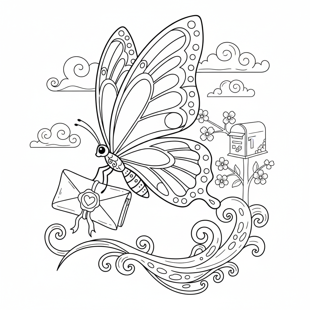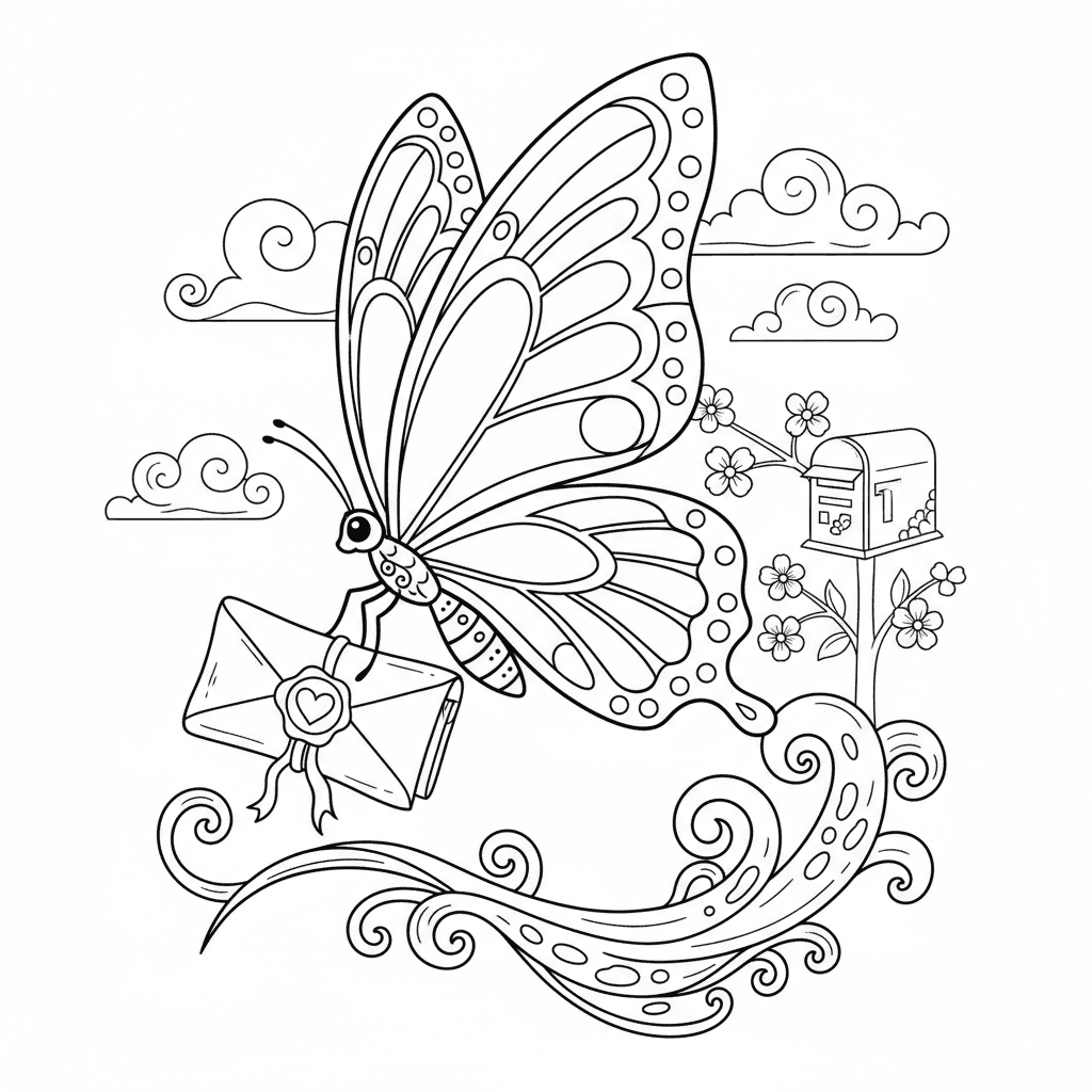 Beautiful butterfly messenger with letter coloring page for kids and adults. Free to download and print.