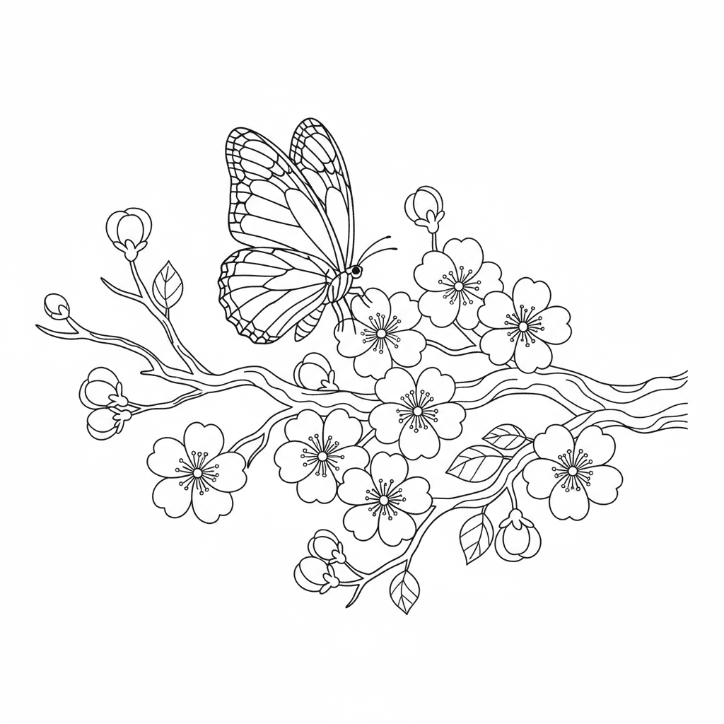 Beautiful butterfly on cherry blossom branch coloring page for kids and adults. Free to download and print.