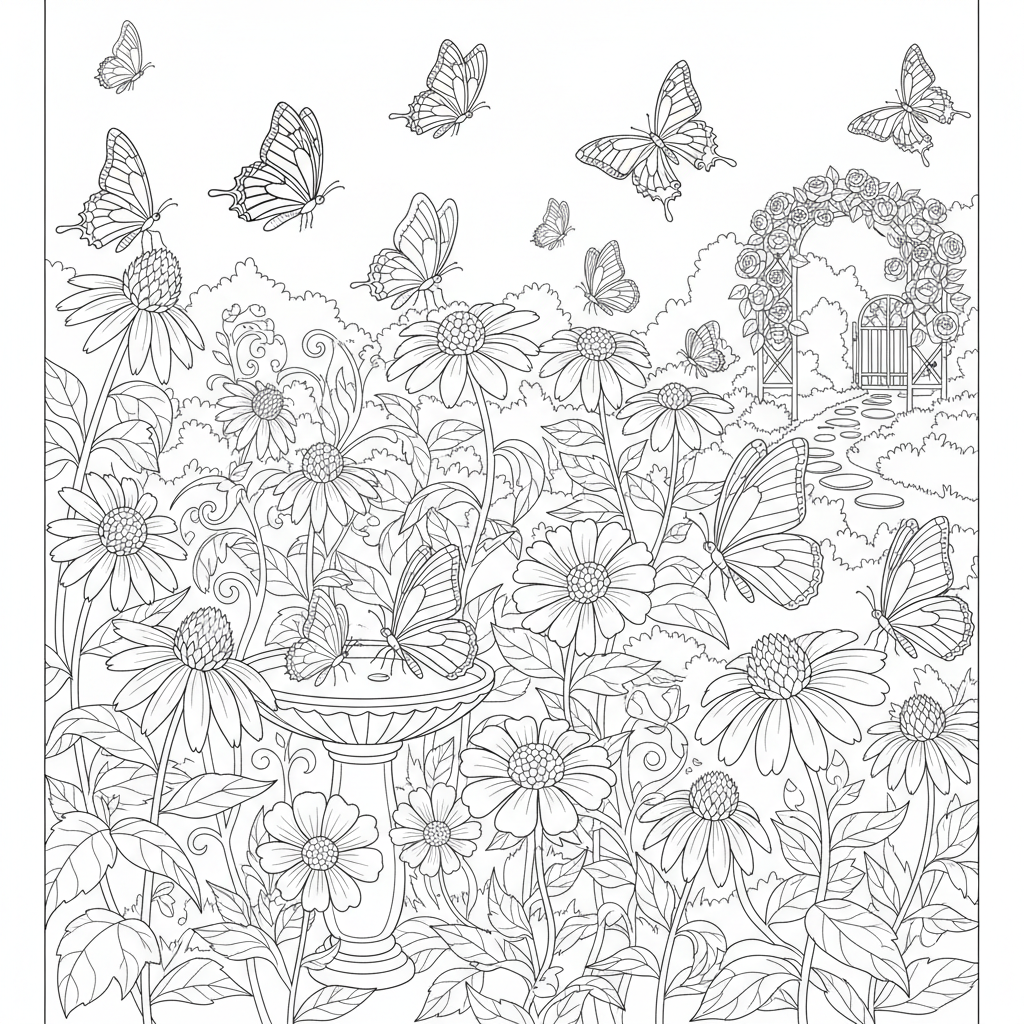 Beautiful group of butterflies at butterfly garden coloring page for kids and adults. Free to download and print.