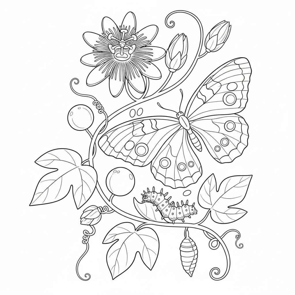 A delightful butterfly coloring page featuring gulf fritillary butterfly passion vine. Perfect for kids and adults who love coloring!