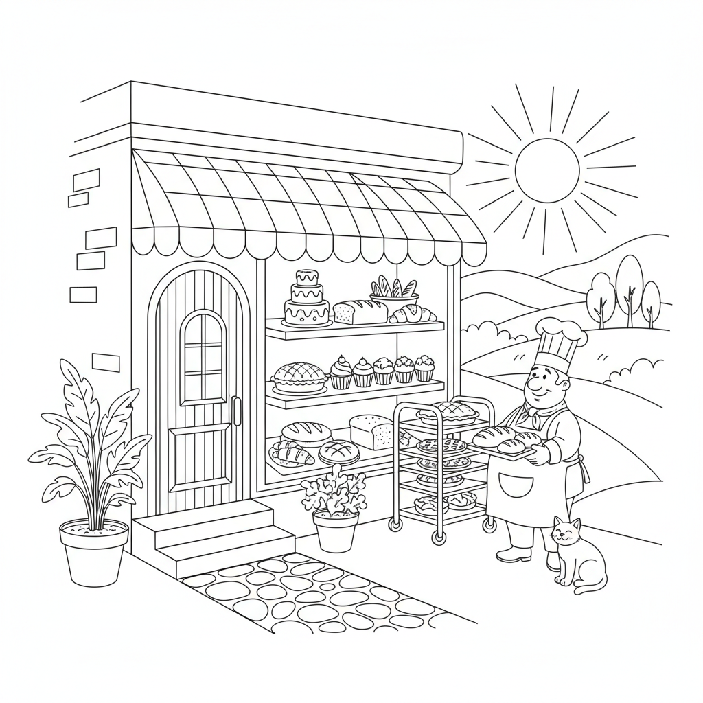 A charming bakery scene with a chef, a cute cat, and shelves full of cakes, bread, and pastries. Perfect for kids who love baking, food, or shop role-play!