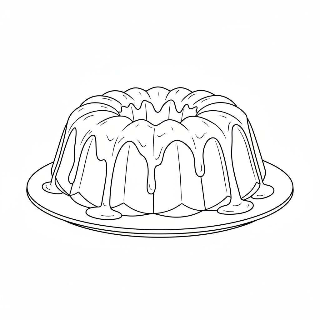 Beautiful bundt cake with glaze dripping coloring page for kids and adults. Free to download and print.