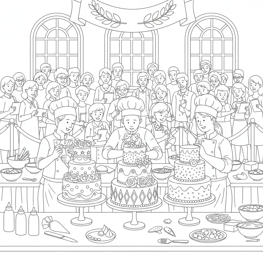 Beautiful cake decorating competition scene coloring page for kids and adults. Free to download and print.