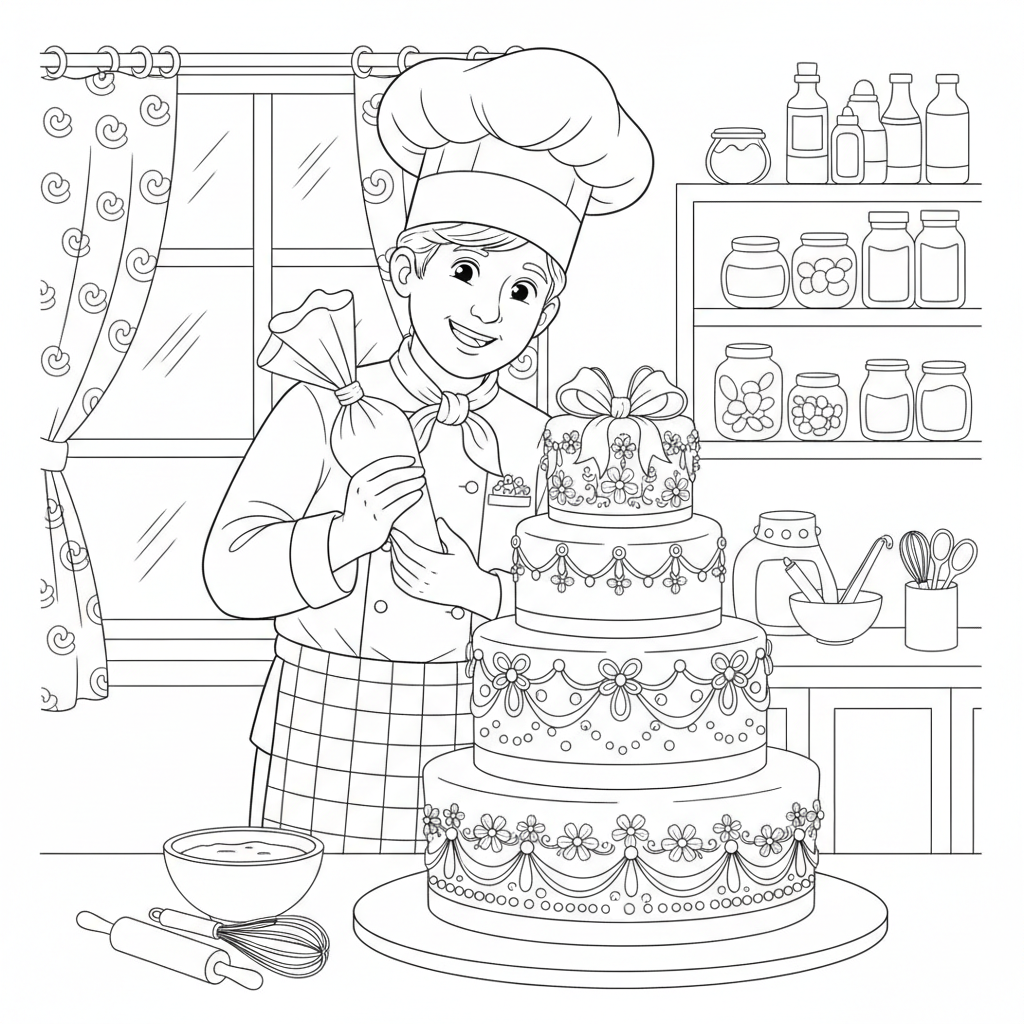 Beautiful chef decorating fancy cake coloring page for kids and adults. Free to download and print.