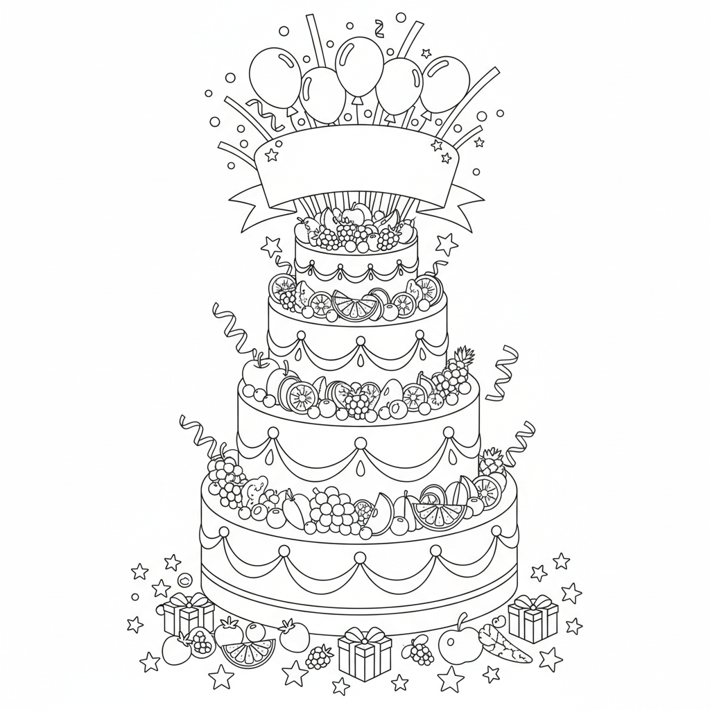 Beautiful tiered fruit cake celebration coloring page for kids and adults. Free to download and print.