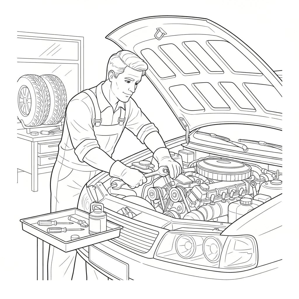 Beautiful car mechanic fixing engine coloring page for kids and adults. Free to download and print.