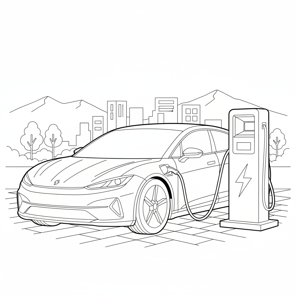 Beautiful electric car at charging station coloring page for kids and adults. Free to download and print.