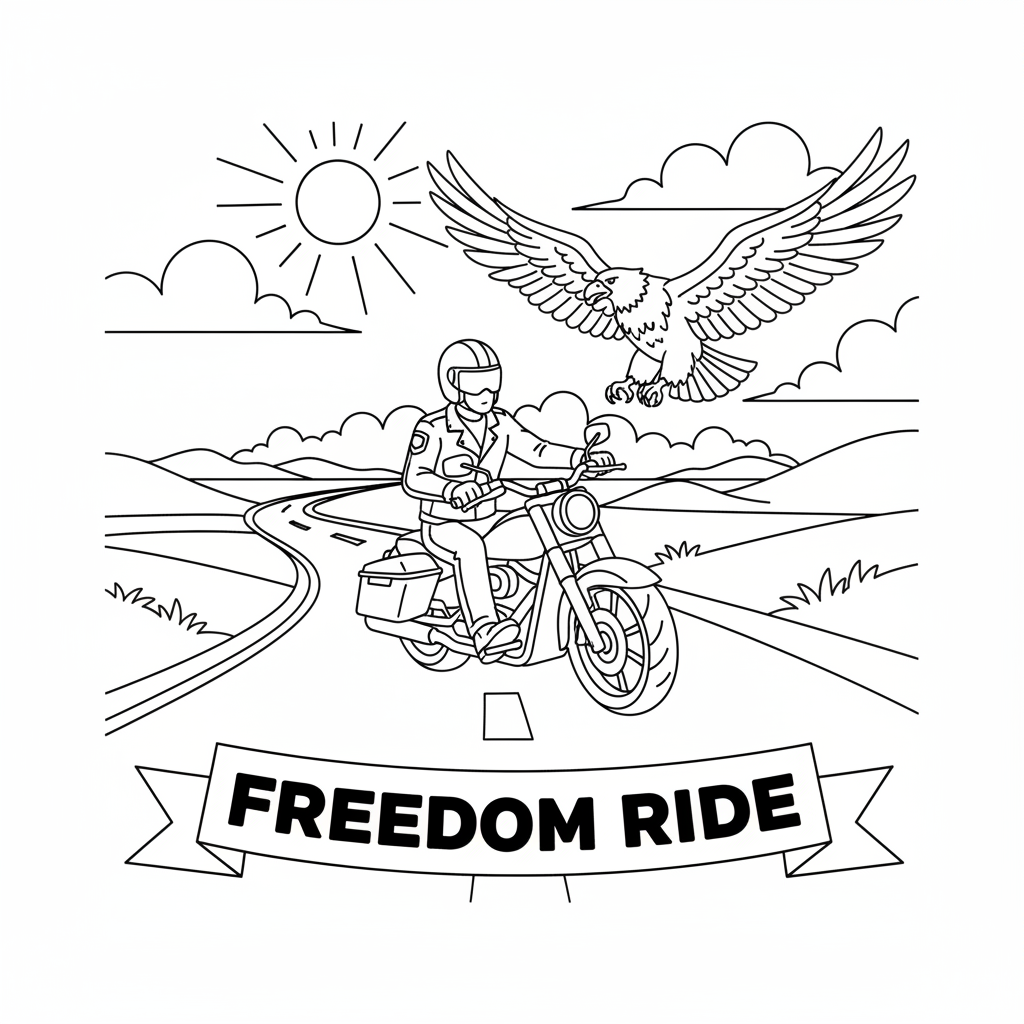 A delightful car coloring page featuring motorcycle rider highway freedom. Perfect for kids and adults who love coloring!