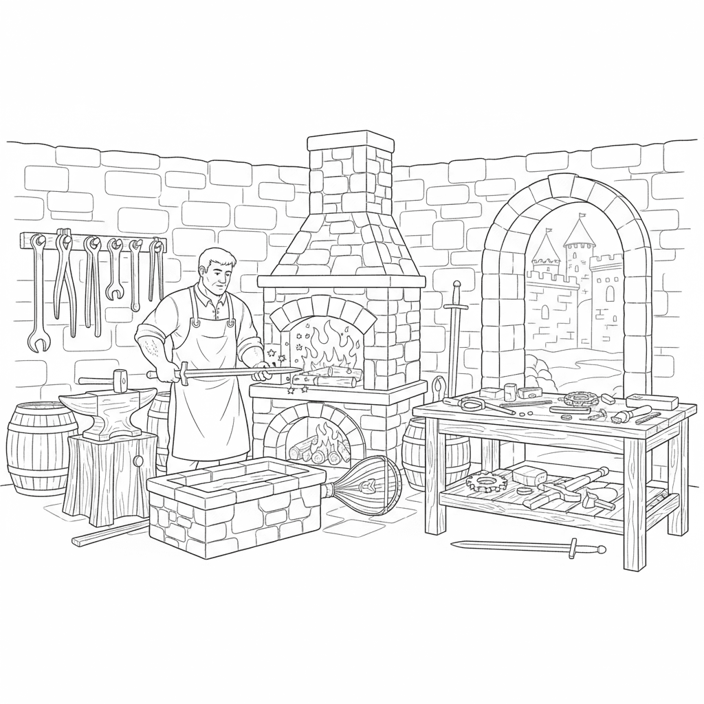 Beautiful castle blacksmith workshop coloring page for kids and adults. Free to download and print.