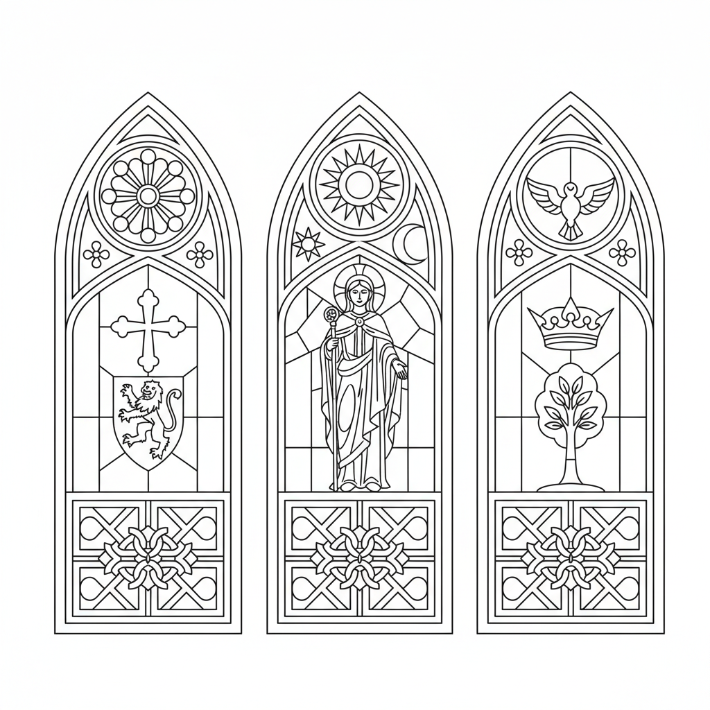 A delightful castle coloring page featuring castle chapel stained glass windows. Perfect for kids and adults who love coloring!