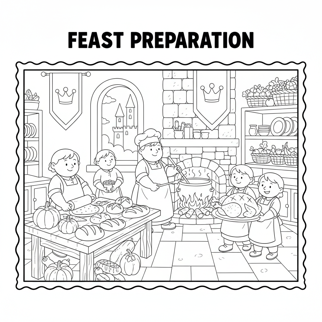 A delightful castle coloring page featuring castle kitchen servants cooking feast. Perfect for kids and adults who love coloring!
