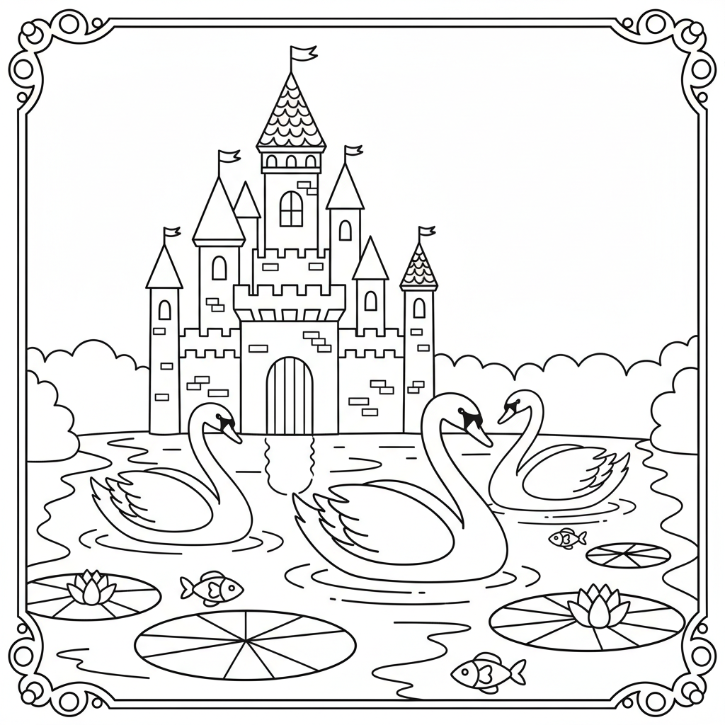 A delightful castle coloring page featuring castle moat swans swimming peaceful. Perfect for kids and adults who love coloring!
