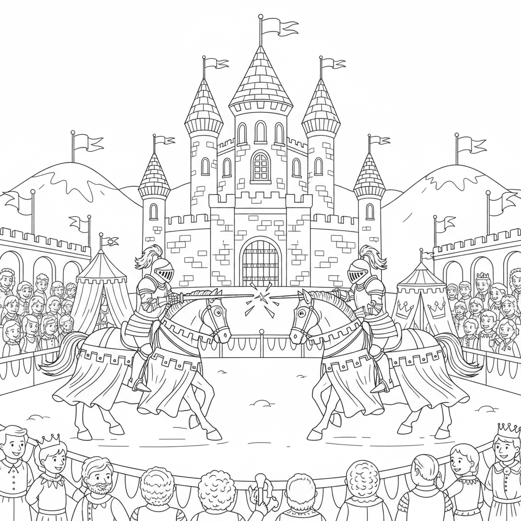 Beautiful castle tournament jousting coloring page for kids and adults. Free to download and print.