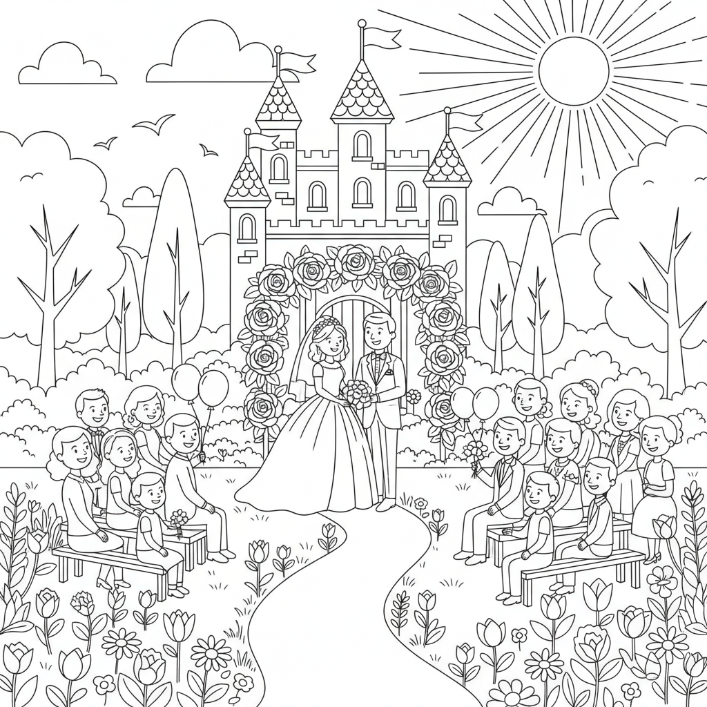 A delightful castle coloring page featuring castle wedding ceremony outdoor garden. Perfect for kids and adults who love coloring!