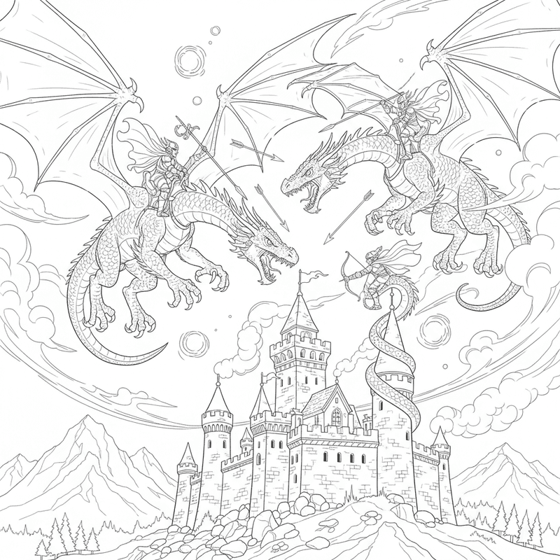 dragons with riders in a conflict over a castle scene