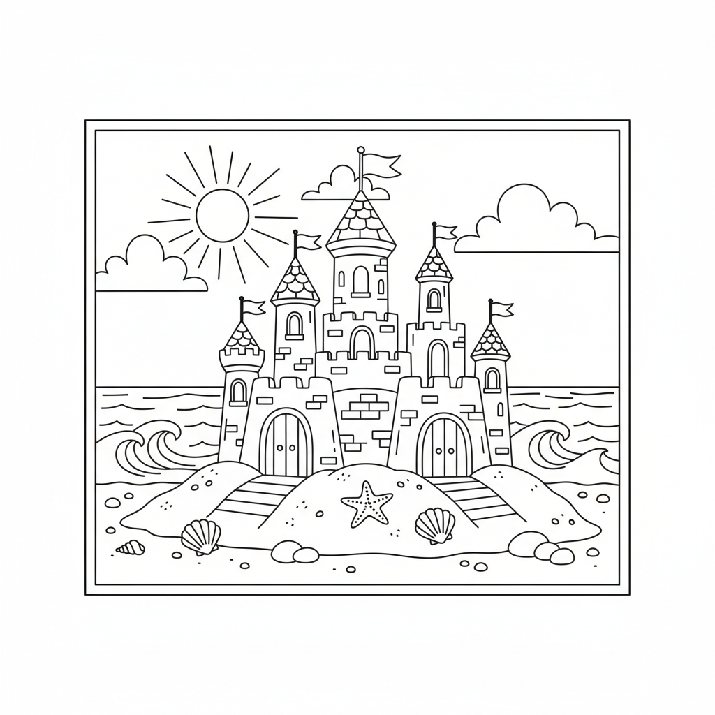 Beautiful sand castle on beach coloring page for kids and adults. Free to download and print.