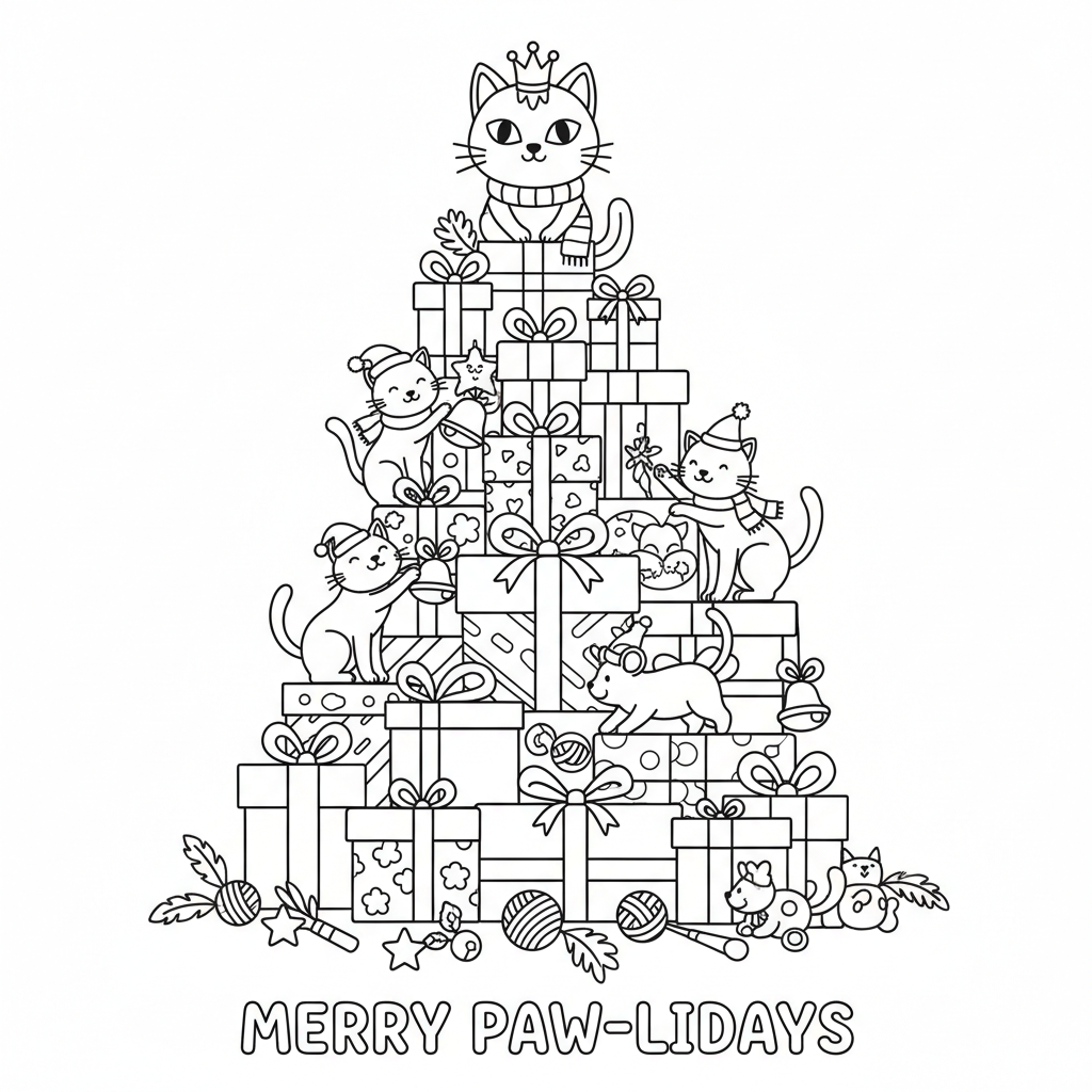 A delightful cat coloring page featuring cat christmas presents tree holiday. Perfect for kids and adults who love coloring!