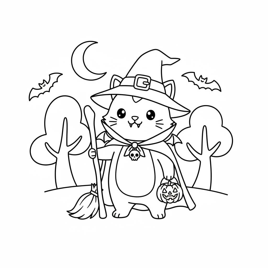 A delightful cat coloring page featuring cat in halloween costume witch vampire. Perfect for kids and adults who love coloring!