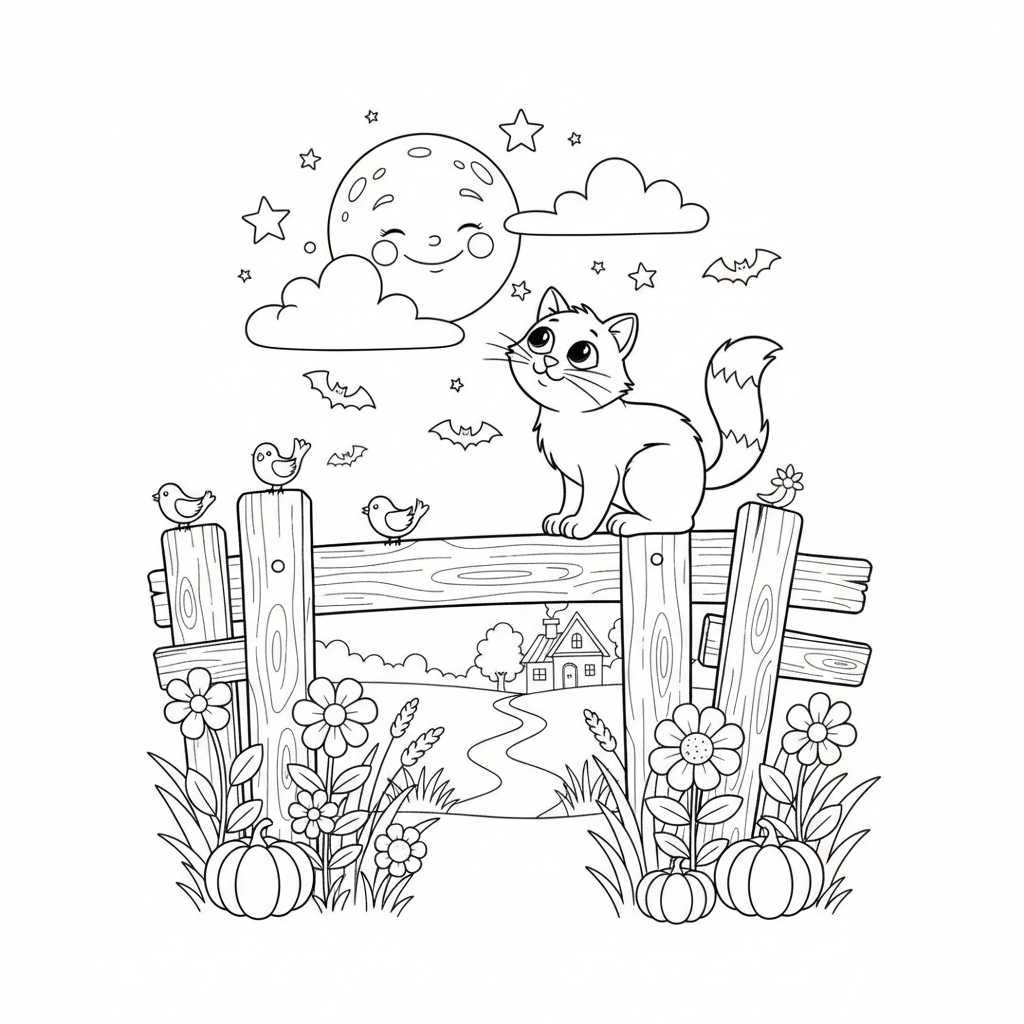A delightful cat coloring page featuring cat on fence nighttime adventure. Perfect for kids and adults who love coloring!