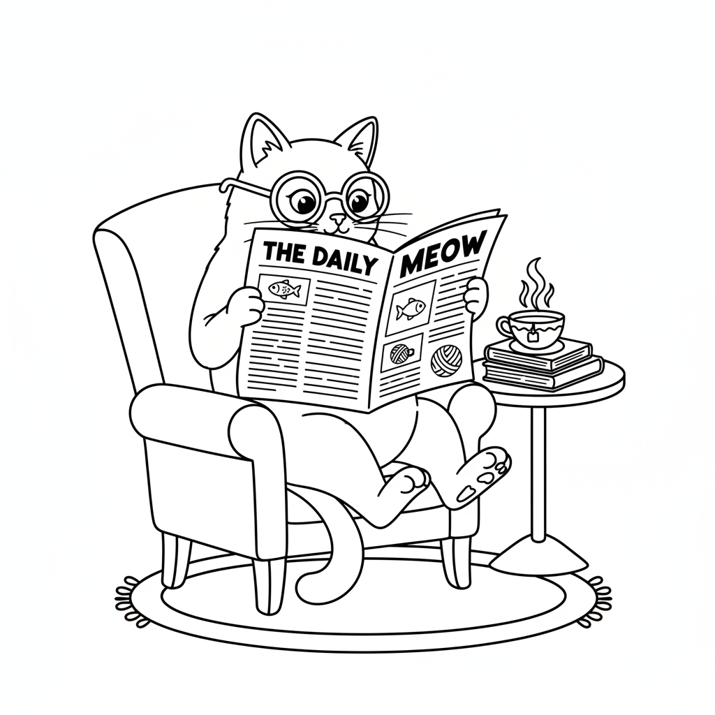 A delightful cat coloring page featuring cat wearing glasses reading newspaper smart. Perfect for kids and adults who love coloring!