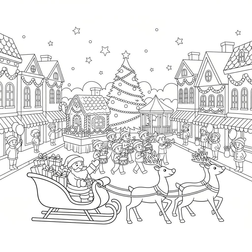 A delightful christmas coloring page featuring christmas parade town celebration. Perfect for kids and adults who love coloring!