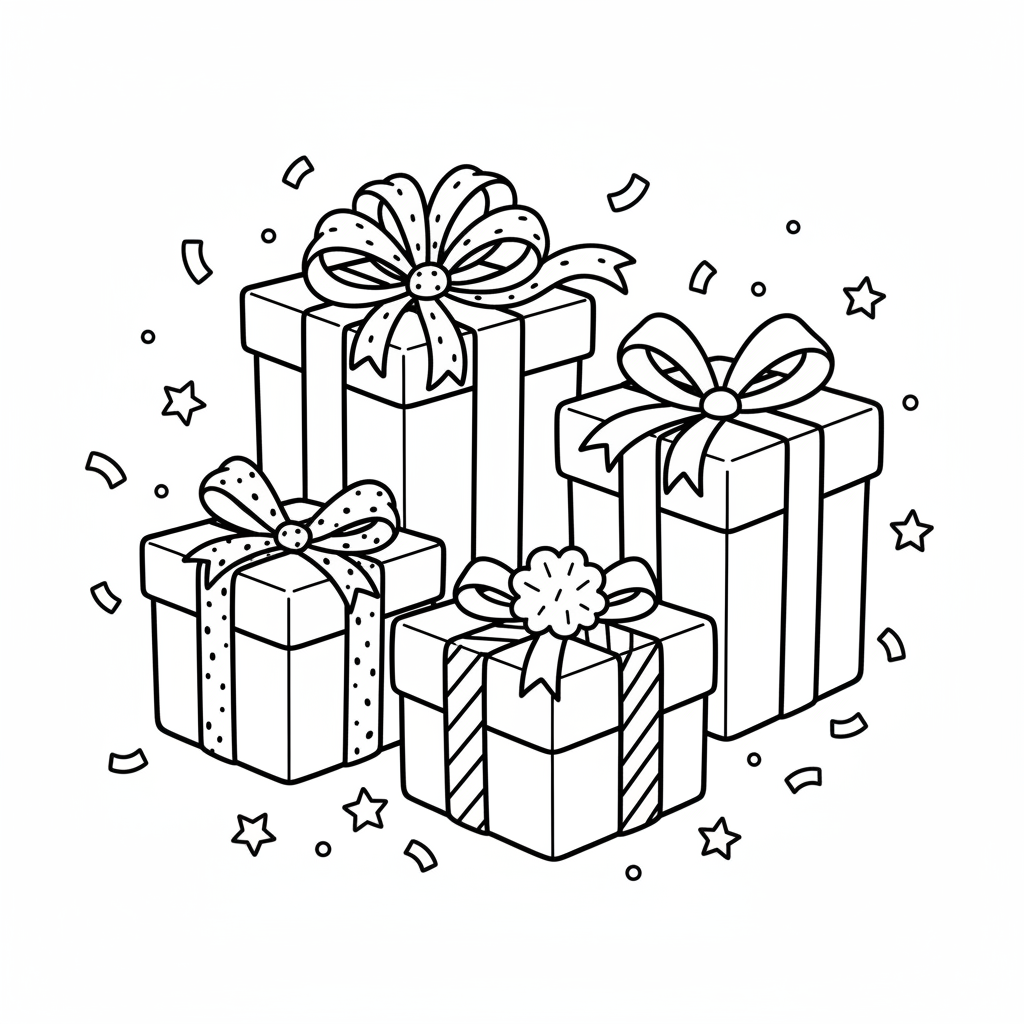 A delightful christmas coloring page featuring gift wrapping presents ribbons bows. Perfect for kids and adults who love coloring!