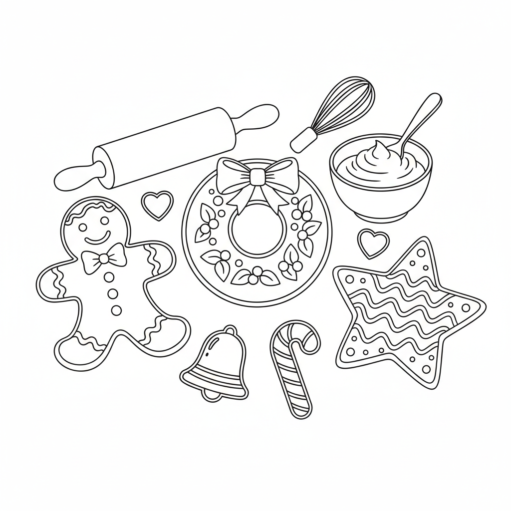 A delightful christmas coloring page featuring holiday baking cookies decorated frosting. Perfect for kids and adults who love coloring!