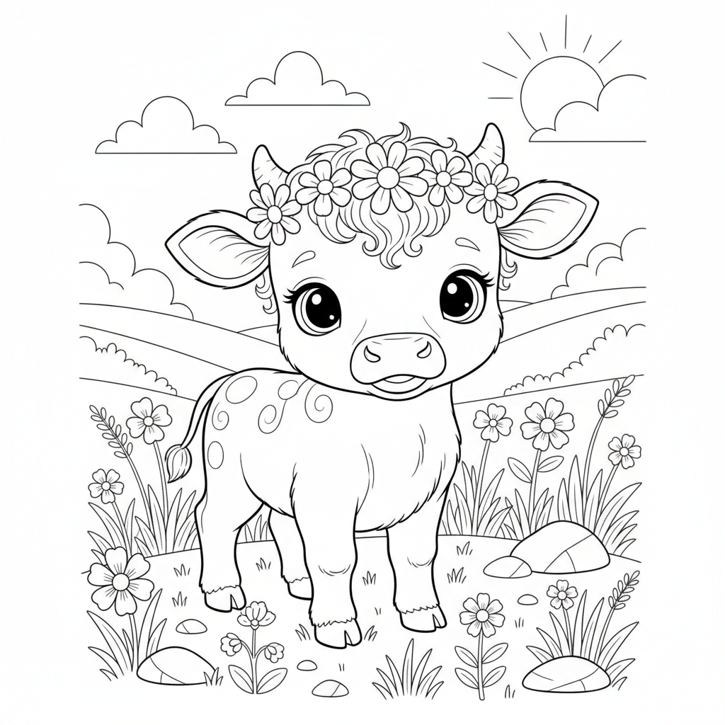 Beautiful adorable baby calf with big eyes standing in meadow coloring page for kids and adults. Free to download and print.