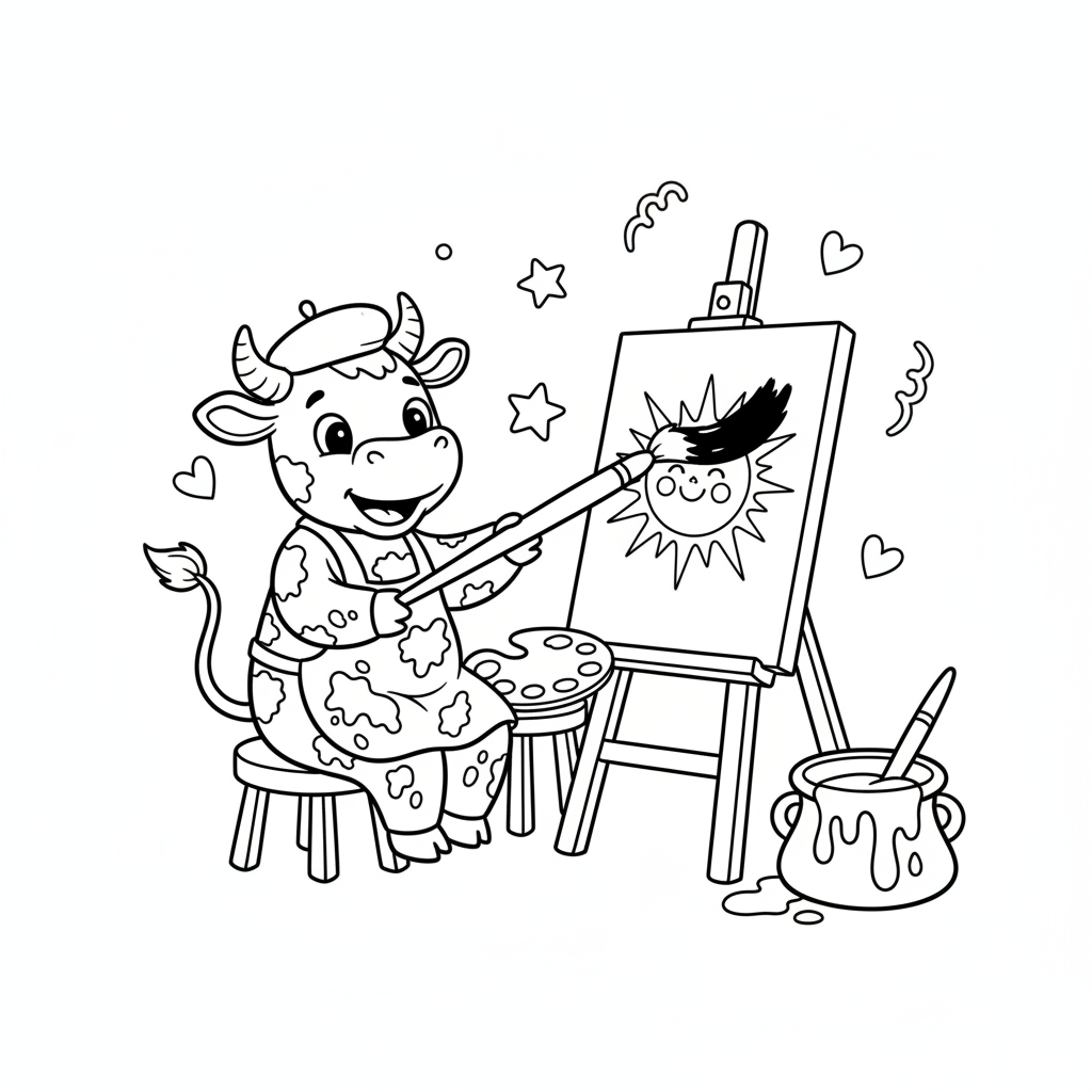A delightful cow coloring page featuring cow artist painting picture tail as brush creative. Perfect for kids and adults who love coloring!