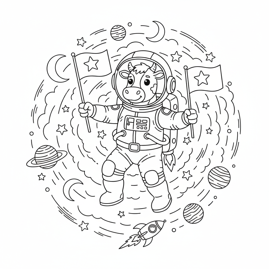 A delightful cow coloring page featuring cow astronaut floating space stars adventure cosmic. Perfect for kids and adults who love coloring!