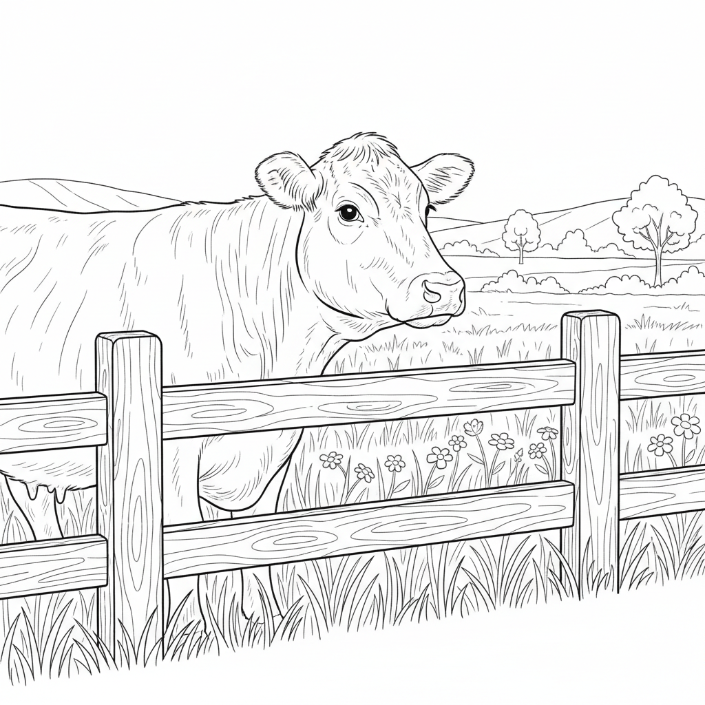 Beautiful cow standing by wooden fence looking over meadow coloring page for kids and adults. Free to download and print.