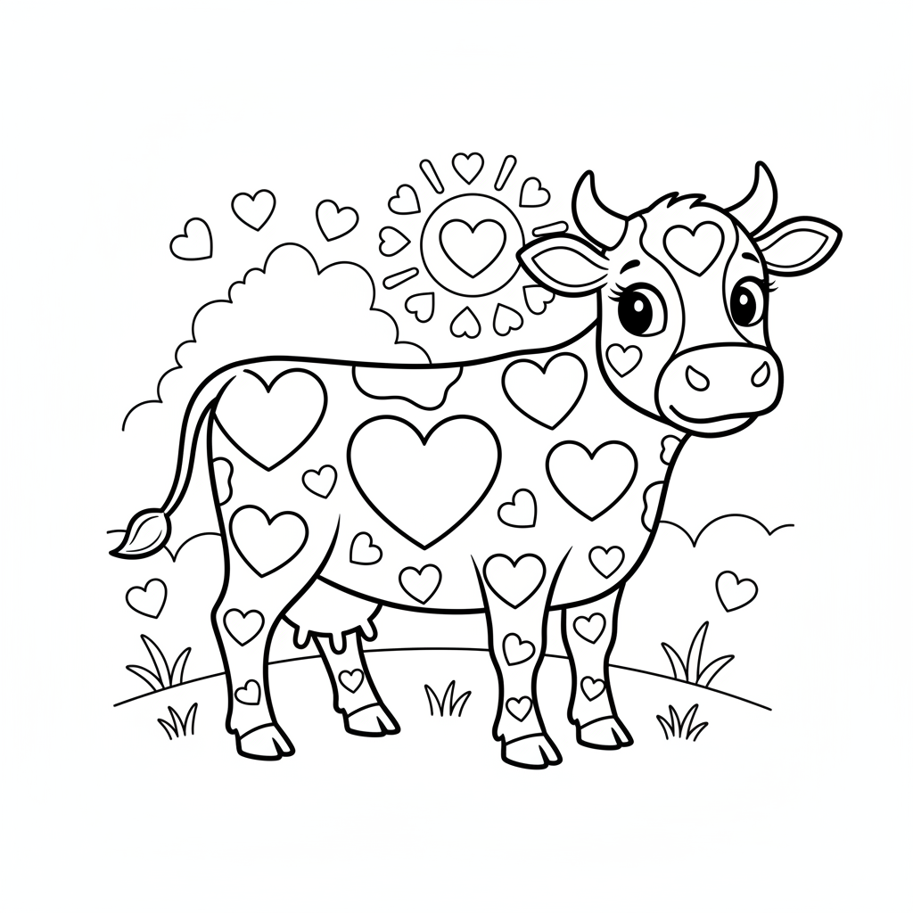 Beautiful cow with spots in heart shapes all over body coloring page for kids and adults. Free to download and print.