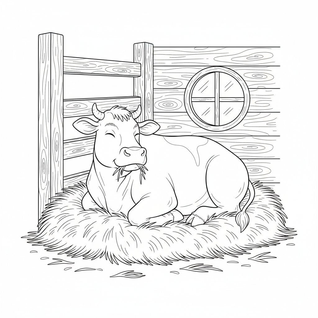 Beautiful sleepy cow lying in soft hay inside cozy barn coloring page for kids and adults. Free to download and print.