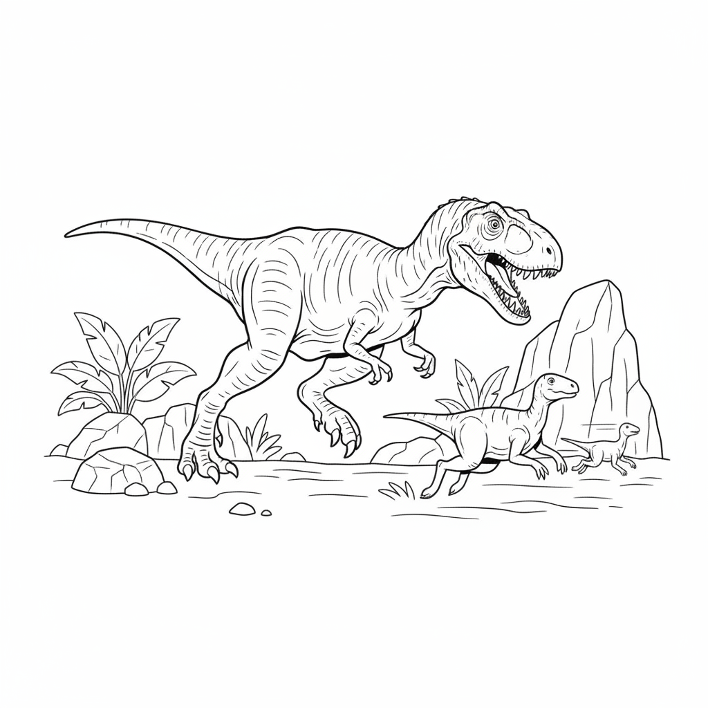 A delightful dinosaur coloring page featuring allosaurus hunting prey action scene. Perfect for kids and adults who love coloring!