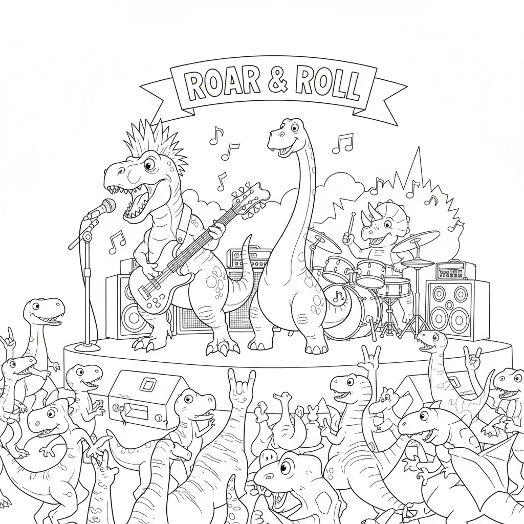 A delightful dinosaur coloring page featuring dinosaur rock band music concert. Perfect for kids and adults who love coloring!