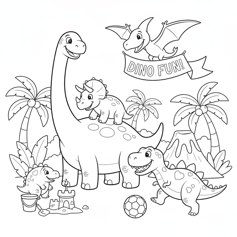 A delightful dinosaur coloring page featuring friendly cartoon dinosaurs playing together. Perfect for kids and adults who love coloring!