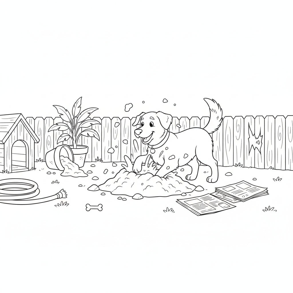 A delightful dog coloring page featuring dog digging in yard backyard mess. Perfect for kids and adults who love coloring!