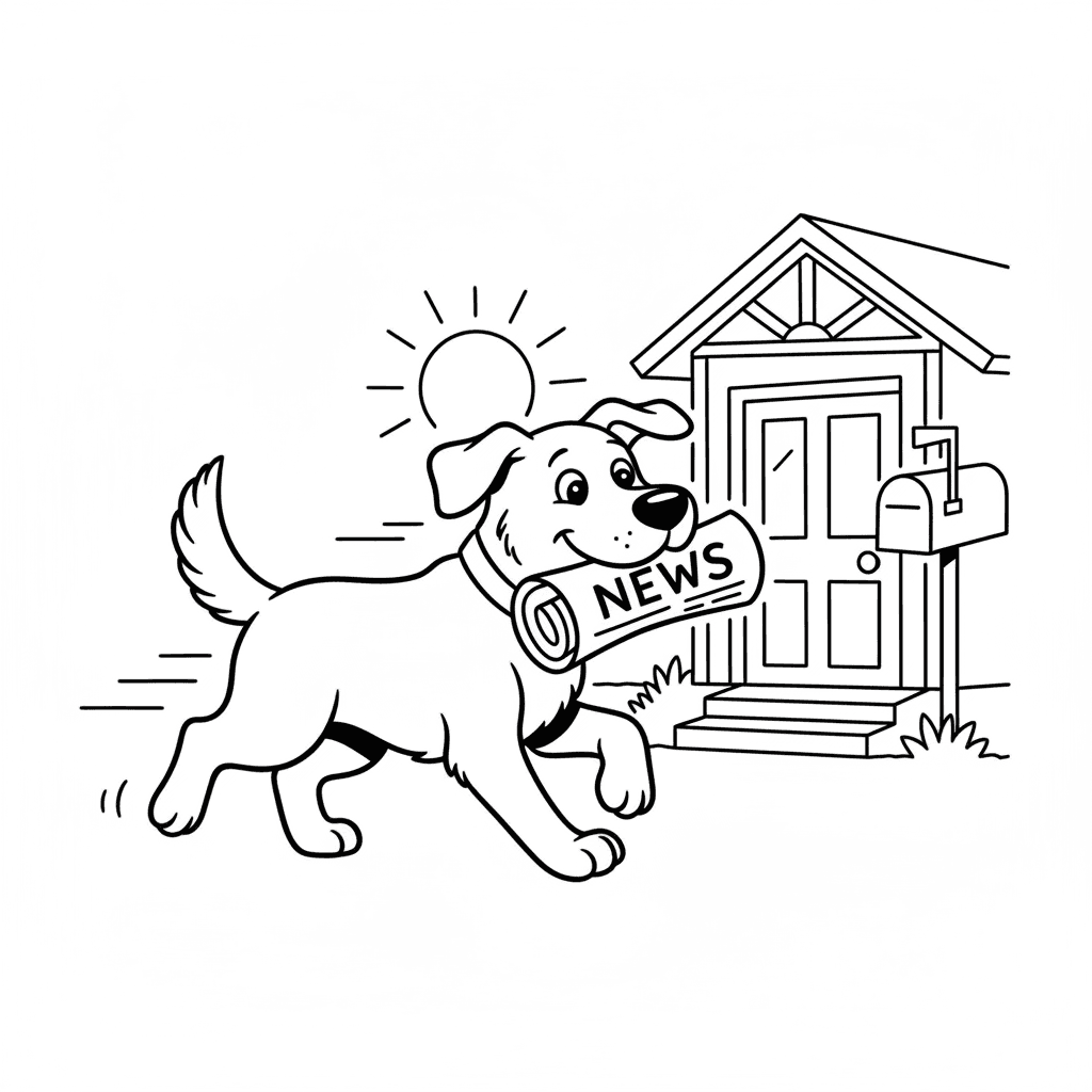 A delightful dog coloring page featuring dog with newspaper fetching morning. Perfect for kids and adults who love coloring!
