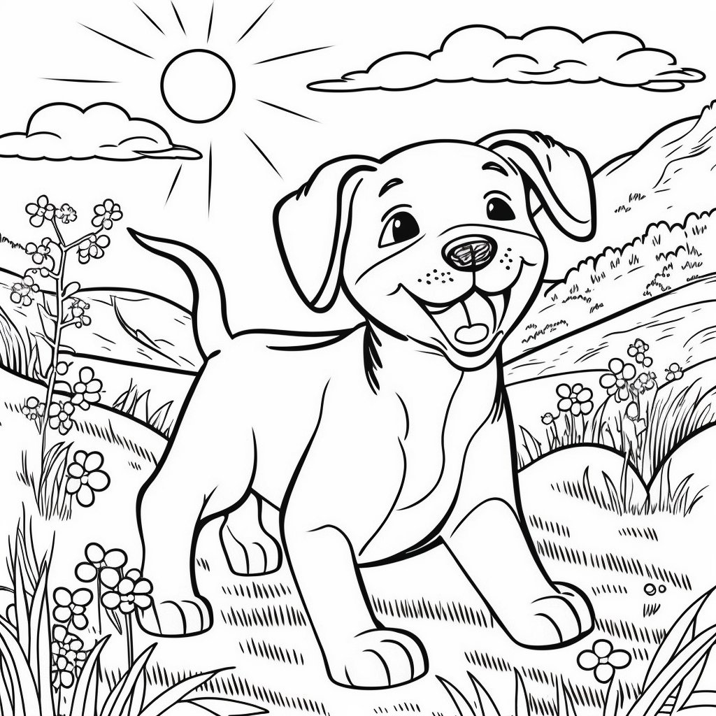 Color this adorable puppy, joyfully exploring a vibrant, flowery meadow under a bright sun. Perfect for kids and dog lovers to unleash their creativity!