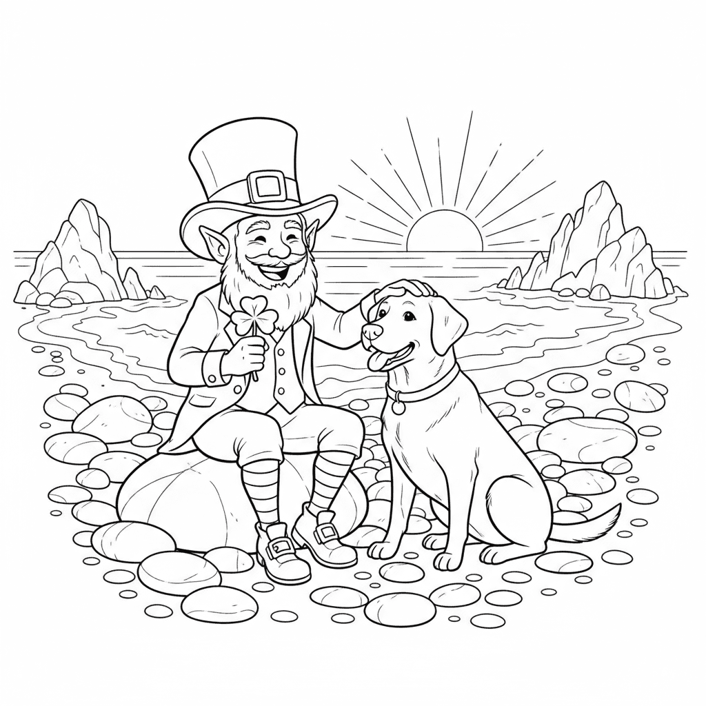 Leprechaun on Pebble Beach with Labrador dog.