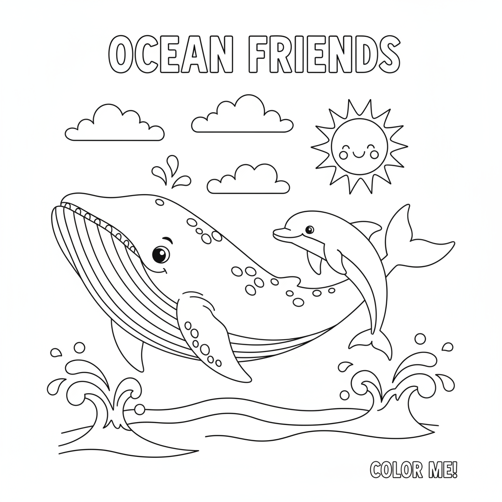 A delightful dolphin coloring page featuring dolphin and whale friends size contrast. Perfect for kids and adults who love coloring!
