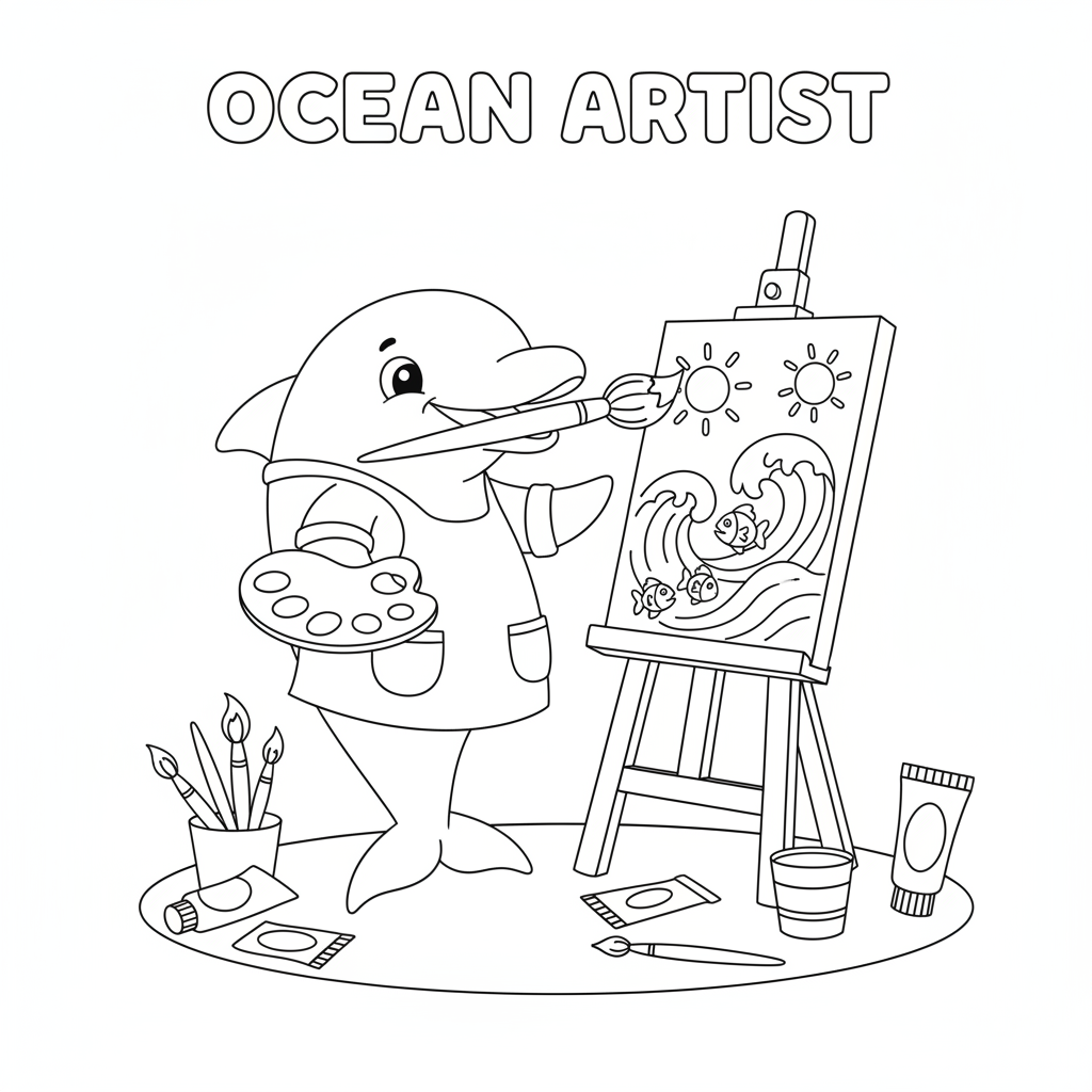 A delightful dolphin coloring page featuring dolphin artist painting ocean scene. Perfect for kids and adults who love coloring!